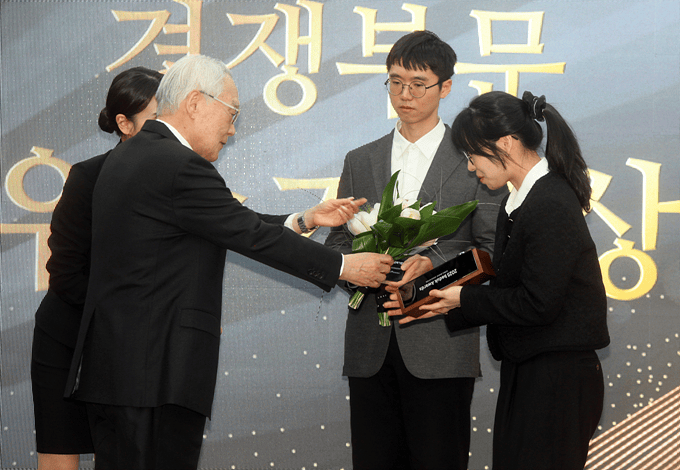 韩国棋院院生郑元灿(音译,颁报酬韩国女子围棋联盟会长李光顺。