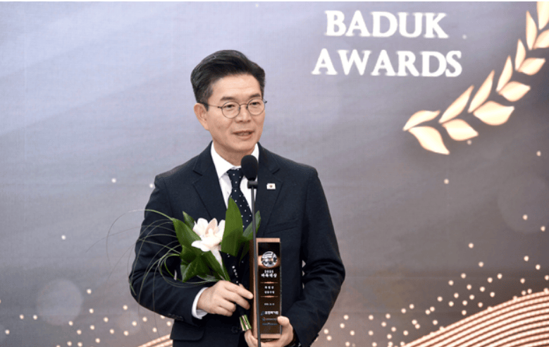 韩国棋院理事长郑泰淳为闻庆市市长申铉国颁布“功绩”,
